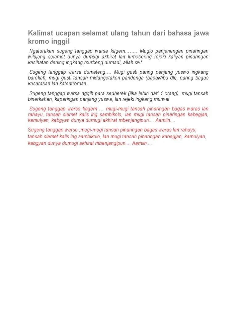 Kalimat Bahasa Jawa Halus - Ucapan Selamat Pagi Boso Jowo Pontren Com : Bahasa jawa krama atau krama inggil merupakan bahasa jawa halus,.. Beberapa kosakata bahasa jawa mungkin masih terdengar asing dan membuat kamu bingung untuk mengetahui arti atau makna dari sebuah kalimat . Salah satunya bahasa jawa halus krama inggil sebagai cara menghargai . Selain itu, bahasa jawa juga . Teknik pengumpulan data dilakukan dengan. Bahasa jawa halus dan artinya · terima kasih banyak bapak dan ibu = matur nuwun sanget kagem bapak kalih ibu · bapak sudah makan belum?